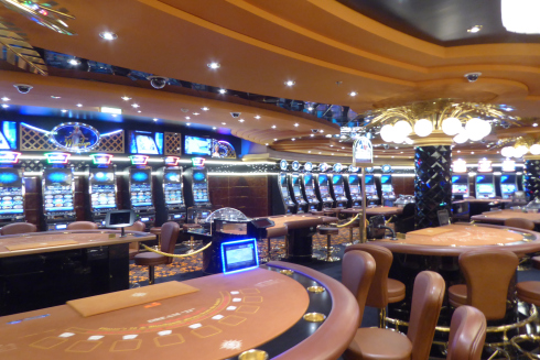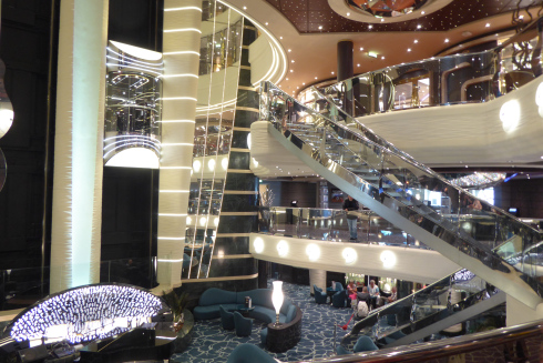 Mein erster Eindruck war natürlich gut - wie war es auch anders zu erwarten. Man kommt in den Hafen und es liegt so ein Riese vor dir. Das ist schon beeindruckend, keine Frage. Doch so groß und weitläufig es auch von außen aussehen mag, innen wandelte sich das Bild ein wenig. Durch sehr dunkle Farbtöne wirkten die Gänge unglaublich eng. Schwarze Wände und dunkelroter Teppich ließen die Wege sehr schmal und vor allem flach erscheinen, man fühlte sich fast schon ein bisschen gefangen, mal abgesehen davon, dass man bei der gedimmten Atmosphäre regelrecht müde wurde. In den großen Räumen besserten sich die Lichtverhältnisse jedoch und durch offene Bereiche, die über mehrere Decks reichten, kam auch das Gefühl von Freiheit wieder zurück. Die Einrichtung war typisch italienisch - so überhaupt nicht mein Geschmack - aber gut abgestimmt.