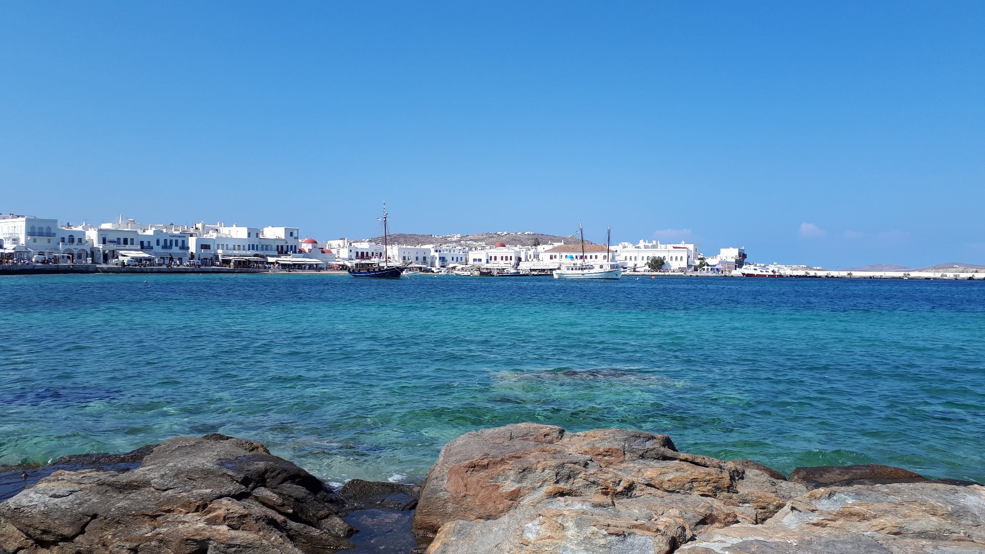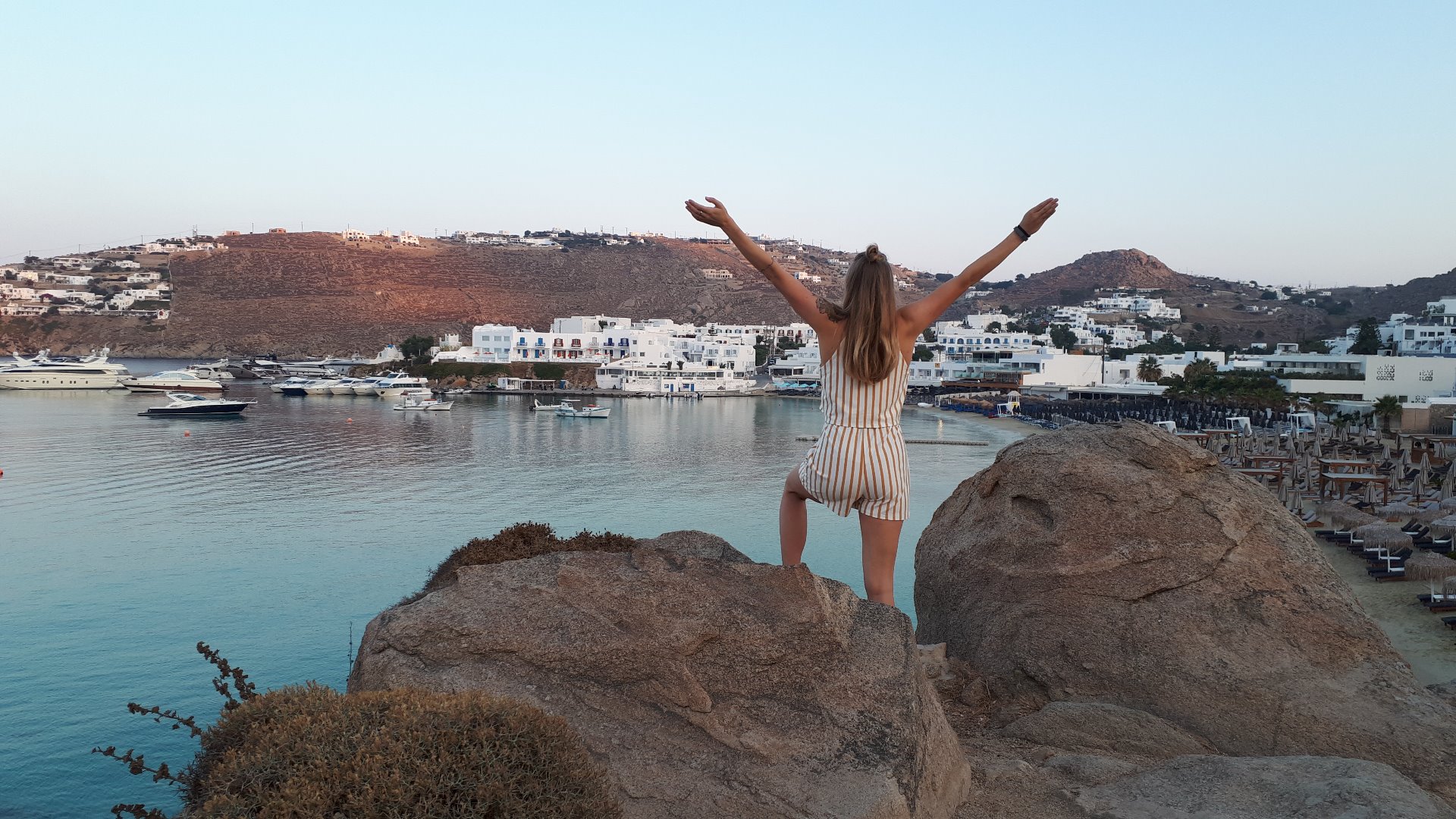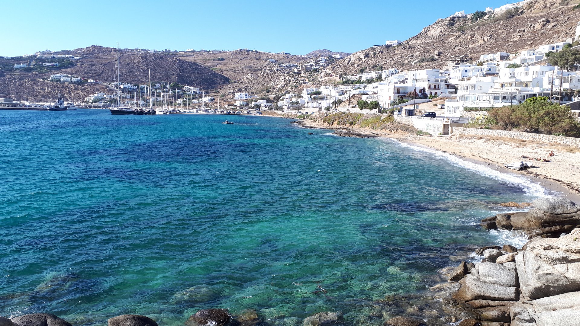 Ein weiterer Tag ging nun also zu Ende. Ich liege mittlerweile auf einer Bank am Yachthafen und spüre überdeutlich die 20km, die ich heute über diese Insel geheizt bin. Auch mein Sonnenbrand macht sich langsam bemerkbar. Genauso wie die unzähligen Mückenstiche, die ich der vergangenen Nacht zu verdanken habe. Morgen geht es schon 8:15 Uhr auf die Fähre. Ich verlasse Mykonos nach einem Tag und zwei Nächten. Und tatsächlich muss ich sagen, so verliebt ich auch in diese Insel bin, dass die Zeit ausreichend war. Ich habe alles gesehen, was ich sehen wollte, lag ein paar Stunden am Strand, habe geiles Gyros gegessen, eine Lieblingsbäckerei gefunden und mich mehr als ausreichend oft in den süßen weißen Gassen der Stadt verlaufen. Vor dem Rückflug werde ich noch einen Tag hier sein, aber bis dahin kehre ich Mykonos nun erst einmal den Rücken zu. Nächste Station - Santorini.