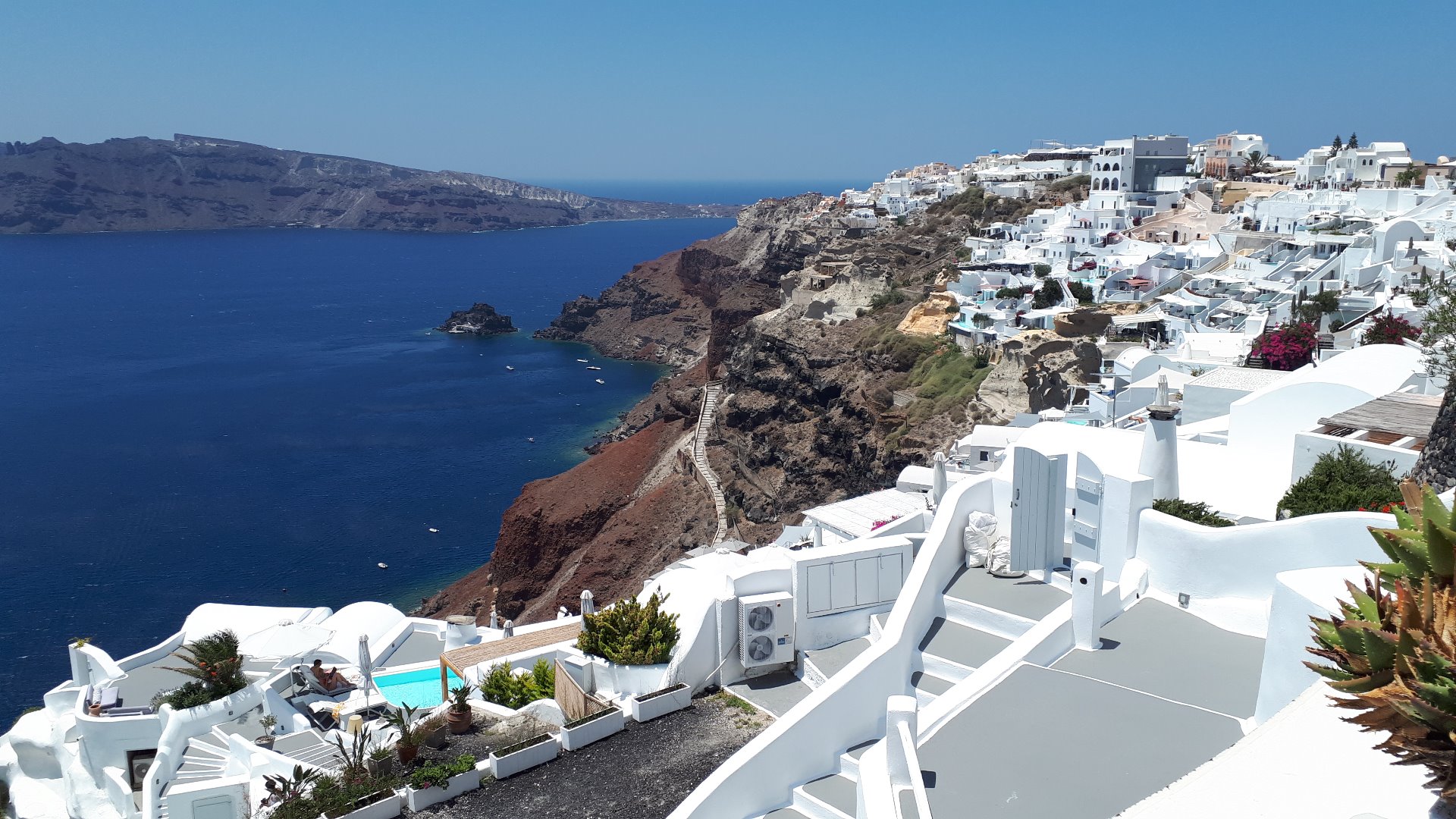 Nach einer fast 6-stündigen Fährfahrt, die ich größtenteils damit verbrachte, Schlaf nachzuholen, erreichte ich 14 Uhr die Insel. Mit dem Public Bus ging es die Serpentinen hinauf nach Fira. Eigentlich wollte ich von hier aus direkt weiter nach Oía, aber irgendwas in mir sagte "Hey, schau dich doch erst mal hier um." - gesagt, getan. Dieser inneren Stimme verdanke ich es, dass ich hier, mitten auf der Insel, mein kleines Paradies gefunden habe. Ich habe mich praktisch im Vorbeigehen spontan für die nächsten Nächte in ein Hostel eingemietet, was schöner kaum sein könnte. Pool mit Meerblick, free WiFi, ein Dorm Room für mich alleine und das alles zu einem unschlagbaren Preis. Wie kann man da noch nein sagen?!