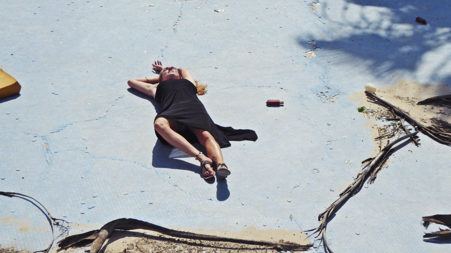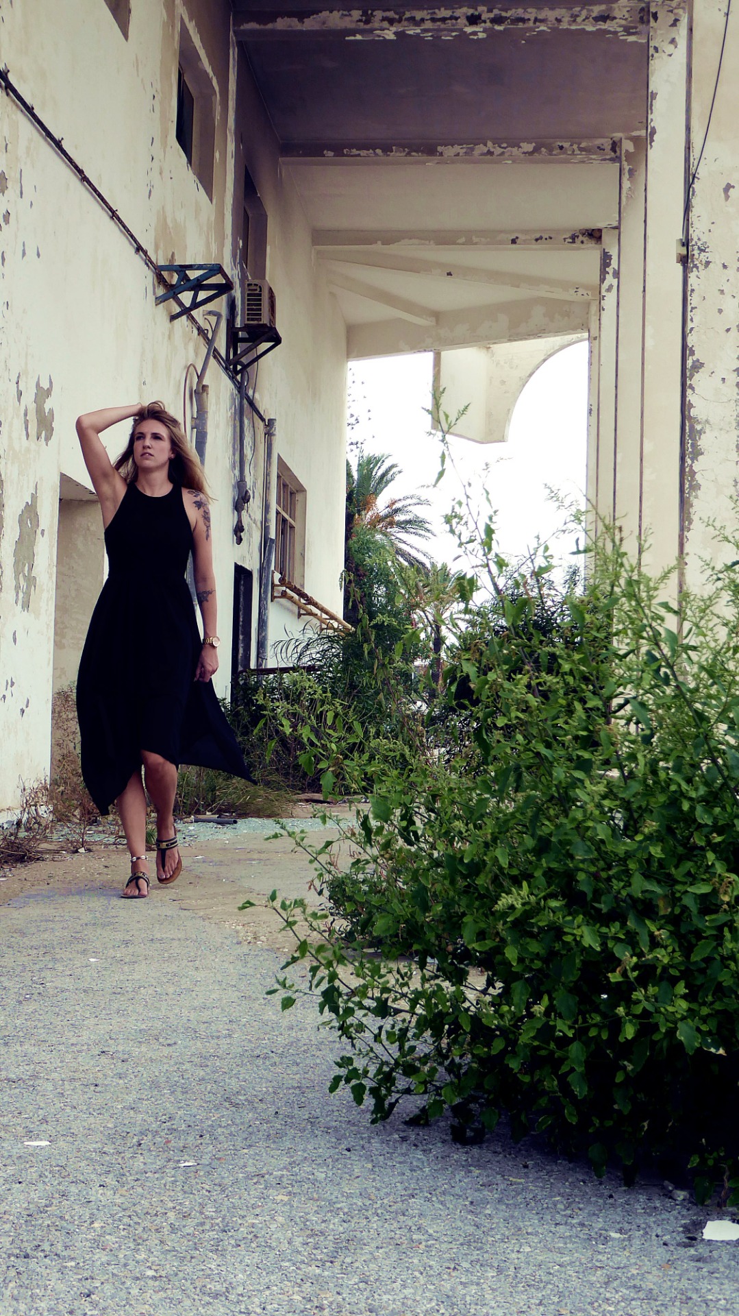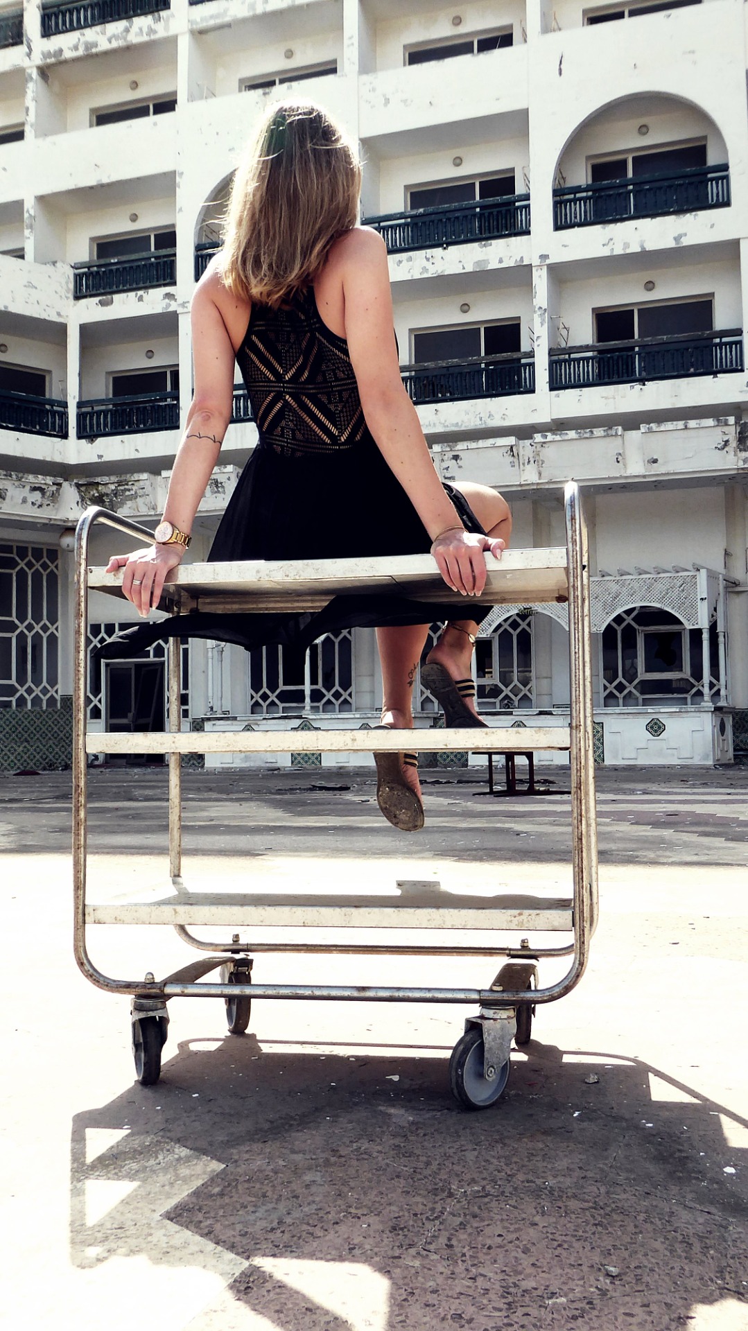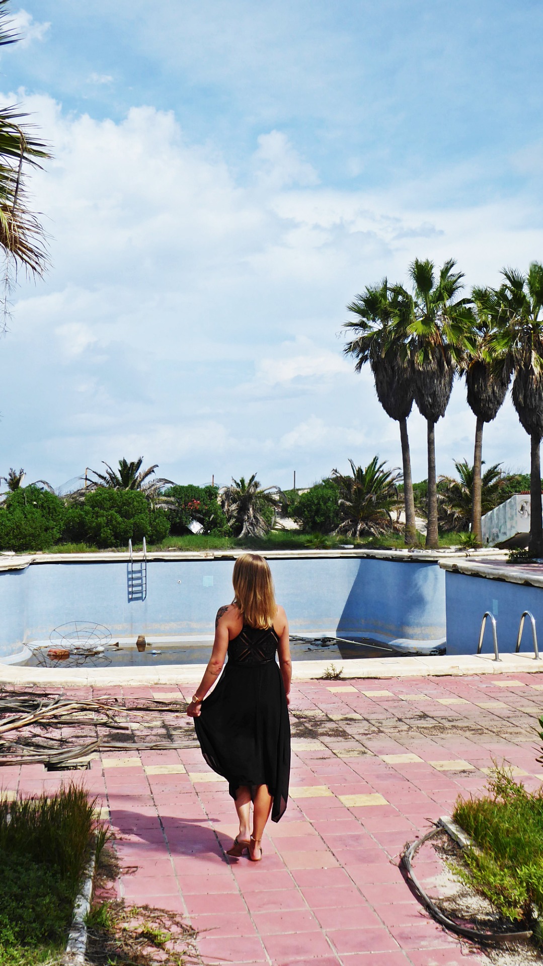 Dieser Anblick ließ mich tatsächlich kurz in Schockstarre zurück. Ich war sprachlos. Auch wenn ich mich zugegeben nur noch sehr blass an diesen Urlaub erinnern konnte, sah ich mich in dem Moment, als wir durch Dünen und Palmen den ersten Blick auf die Anlage werfen konnten, wieder ganz deutlich auf der Brücke über dem Pool stehen. Hier war ich. Ein kleiner Teenager im Herbsturlaub. Und alles war weg. Kaputt. Verlassen.
