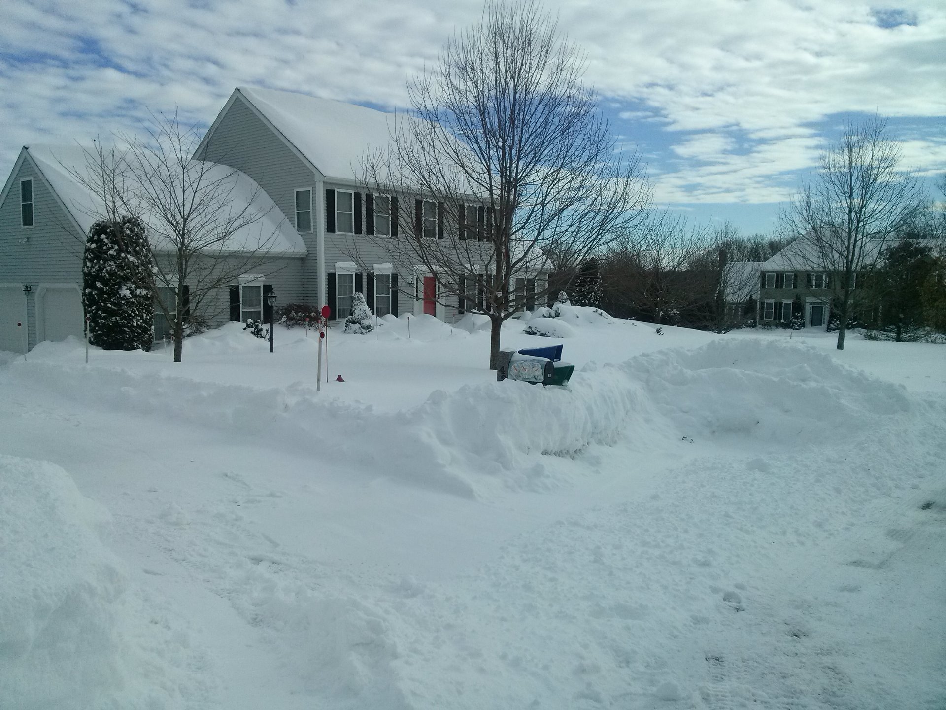 Puenktlich zum Bergfest hat mir auch das Wetter ein Geschenk mitgebracht. Es werden wahrscheinlich einige von euch in den Nachrichten gesehen oder gehoert haben, dass seit Montag an der gesamten oberen Ostkueste etwas Land unter ist. "Forecast: Possibly Historic Blizzard To Hit Boston Monday Into Tuesday" - Ich stelle vor: Snow Storm Juno. So sassen wir also Sonntag Abend ueber dem Wochenplan und schmiedeten Notfallplaene. Es sollte Montag gegen Nachmittag losgehen. Wir erwarteten ueber Nacht ca 36″ Schnee (also knapp einen Meter) und Sturm in Hurricane-Staerke, sowie starke Boehen und Ueberflutungen an den Kuesten von Massachusetts. Laut Plan hatte ich die Ehre hatte sowohl Montag als auch Dienstag die Maedels in die Schule zu fahren und auch wieder abzuholen. Demnach wollte ich natuerlich so gut es ging vorausplanen, damit ich mit den Maedels noch rechtzeitig vom Highway runter komme, eh der krasse Verkehr losgeht, weil alle ploetzlich auf einen Schlag nach Hause wollen bzw Heim geschickt werden. Man munkelte sogar schon von eventuellem State Emergency, sprich Notstand, was so viel bedeutet wie: Schulen geschlossen, Fahrverbot, etc. Wenn das der Fall waere, haette ich sogar eine Death Line gehabt. YAY! ...Es dauerte dann am Montag auch nicht lange, bis der Anruf von der Schule kam: Alle After School Activities werden gecancelt. Keine Schule am Dienstag. Ok - das war abzusehen. Hatte den Vorteil, dass wir vor dem grossen Ansturm auf den Strassen zurueck nach Hause kommen konnten. Die Lehrer hatten natuerlich sicher gestellt, dass keiner ihrer Schueler den freien Tag entspannt zu Hause chillen konnte. Es hagelte Hausaufgaben ueber Hausaufgaben. Demnach war mein Kind gut beschaeftigt und ich durfte mich Dienstag unter anderem Kohlekreislaeufen, Umwelttechnologien, Franzoesischvokabeln und der Klimaerwaermung widmen. DEN GANZEN TAG!! Ich frag mich manchmal, warum dieses Kind nicht in der Lage ist, allein zu lernen.. Ich hab ja kein Problem damit, sie abzufragen.. aber nicht 10x hintereinander ueber immer wieder das gleiche, bis sie der Meinung ist, dass sie es kann und wir das naechste anfangen koennen. Die einzige laengere Unterbrechung brachte mich fuer knappe 2 Stunden raus in den Schneesturm - zum Einfahrt frei schippen. Nun ist unsere Einfahrt ja gleich mal so lang, dass man 3 grosse Autos hintereinander und in zwei Reihen nebeneinander parken kann. Und ueberall lagen ca 70cm Schnee. Wir schaufelten uns also erst mal einen Weg aus dem Haus raus, bevor ich dann anfing mein kaum noch sichtbares Auto auszubuddeln und Annemarie mit dem Snowblower (THANK GOD fuer diese Erfindung!) den Driveway freilegte, damit wir ihr mit den Schaufeln hinterher schippen konnten, um einen vernuenftigen Weg zu bekommen. Da mein Hostdad nicht zu Hause war (er arbeitet fuer die Energieversorgung und durfte deswegen nicht wie alle anderen Heim, sondern musste extra Schichten schieben, damit uns nicht das Licht ausgeht), konnten wir es nun nicht bei einem Weg zu Strasse und wieder zurueck belassen, sondern mussten die gesamte Flaeche frei schieben, damit er mit dem Auto rein kommt. Mein Workout fuer diesen Tag stand also fest. Aber bevor ich ueberhaupt raus konnte, wurde ich erst mal vollgenoelt, weil ich mich nicht in 10 Skihosen eingepackt hatte, sondern einfach nur ne Leggins unter meiner Jogginghose hatte und mit Pulli und Jacke raus wollte. Ist ja nett, dass sie nicht wollen, dass ich friere. Aber nur weil ich aus Deutschland bin, heisst das nicht, dass ich nicht weiss, dass Schnee kalt und nass ist. Aber ich wollte mich ja auch nicht reinlegen. Und beim Schnee schieben schwitzt man sich eh zu Tode, wenns an solche Massen geht. Aber vielleicht ist der Schnee hier ja anders. Woher soll ich das schon wissen... Am Ende waren das einzige, was mir abgefroren ist, meine Finger. Aber das hab ich bestimmt von Papa geerbt ;D So stand ich nach Ewigkeiten des Schaufelns durchgeschwitzt und mit am Schal festgefrorenen Haaren im Schnee, hab mich gefreut wie ein (-Achtung-) Schneekoenig und durfte zum Abschluss sogar noch mal in den hochgeschaufelten Berg huepfen, damit ich auch wirklich ueberall klatsch nass und weiss war. Der Tag endete schliesslich damit, dass die Schule ein zweites Mal anrief und uns mitteilte, dass Julia auch den Mittwoch noch daheim verbringen durfte - war auch irgendwie klar. Wenn die Menschen schon kaum aus ihren Haeusern raus kamen, wer sollte dann die Schule frei schaufeln?