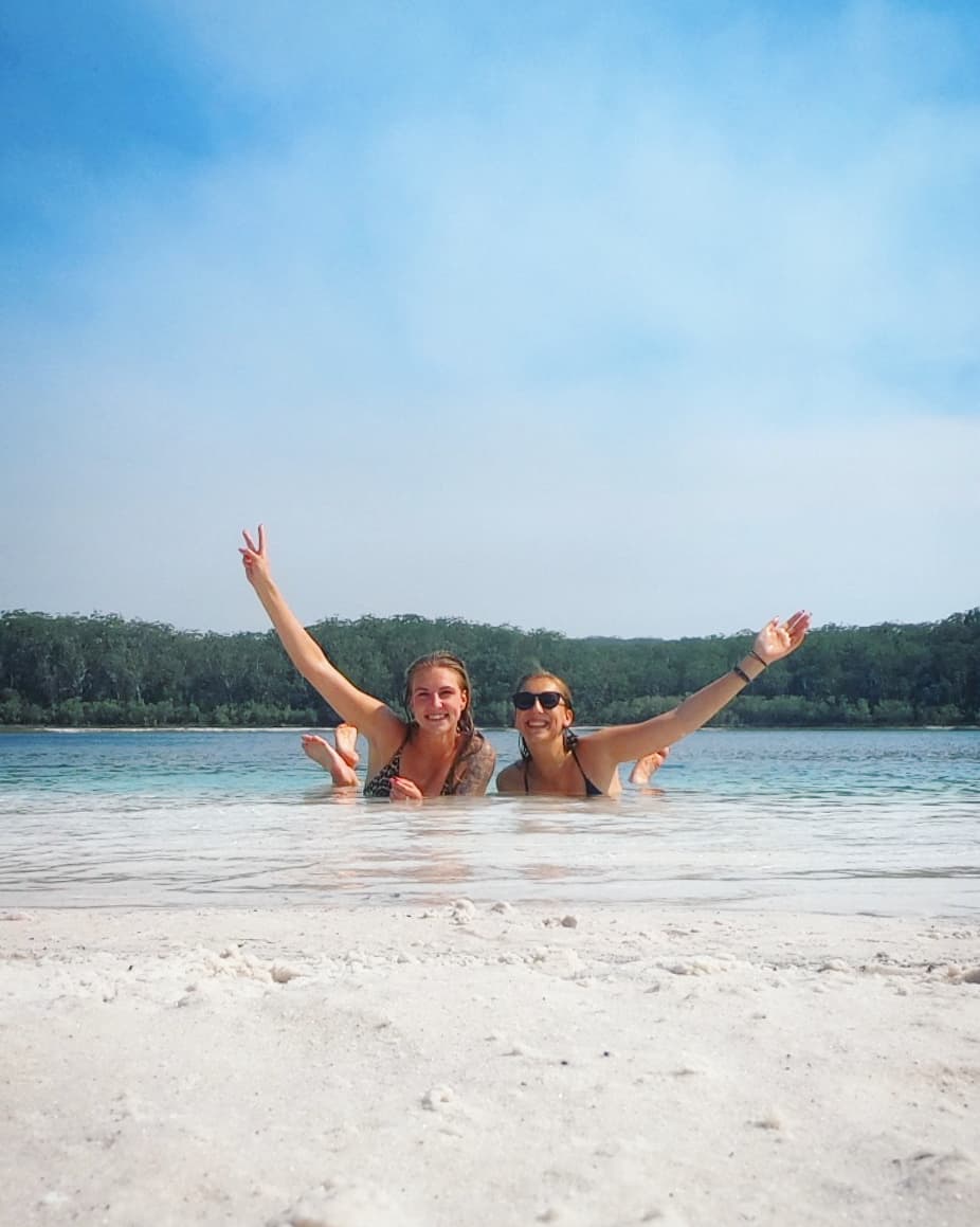 Wir hatten 4 Autos mit jeweils 8 Leuten drin, eine kleine süße Kolonne also. Es ging am ersten Tag früh los und mit der Fähre rüber nach Fraser Island. Uns war klar, dass es ziemlich wackelig werden würde, aber selbst in meinen schlimmsten Träumen hatte ich mir Offroad Touren weitaus angenehmer ausgemalt. Mit blauen Knien und mehrfach eingehauenem Kopf kamen wir nach dem Mittagessen (Wraps mit viel viel Sand) an unserem ersten Stop an: Lake McKenzie. Und WOW!!